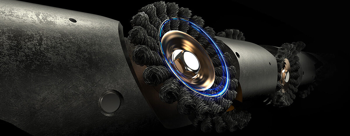 The brush provides an effective means of cleaning, deburring and removing scale from a range of completion components, varying from safety valves to landing nipple seal bores. The wheels offer rotation in both directions which allows the tool to effectively remove scale and maximise deburring of damaged seal bores.